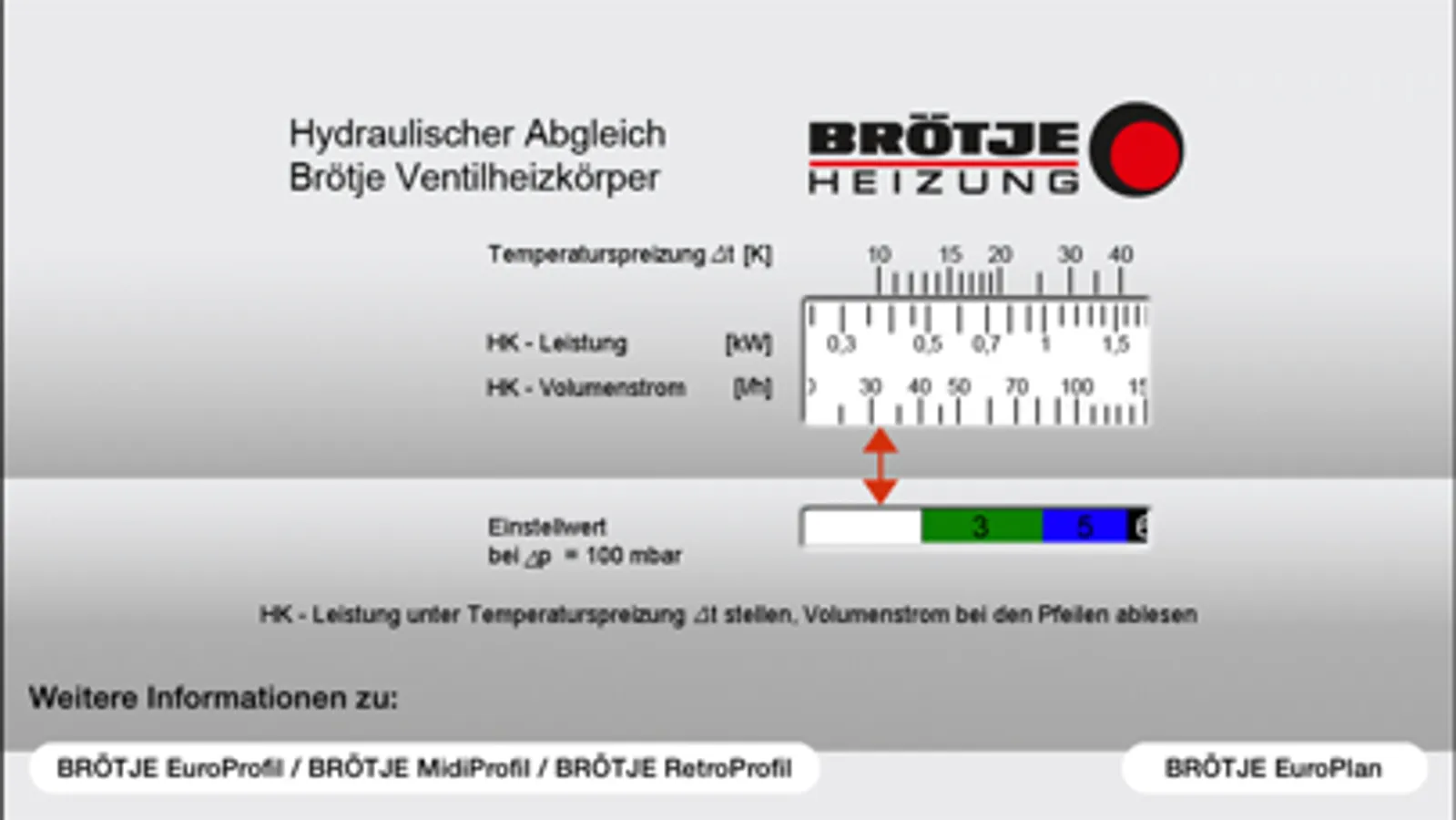 Mit dieser App kann der Fachhandwerker vor Ort schnell und sicher die Voreinstellungen für die BRÖTJE Heizkörper ermitteln. Hierzu benötigt er lediglich die notwendige Leistung für den Raum und die jeweilige Temperaturdifferenz.