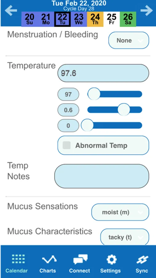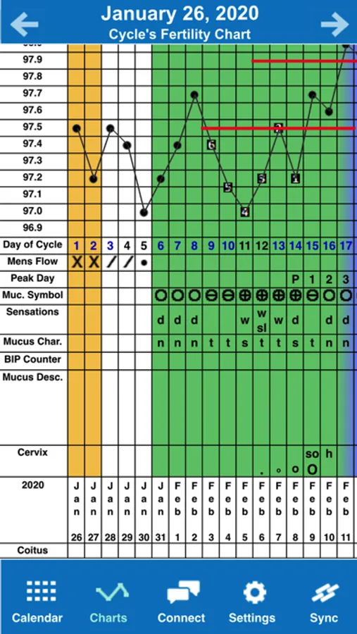 All the fertility signs associated with CCL’s method can be recorded, including menstruation, temperature, mucus sensations and characteristics, and the cervix sign. CycleProGo allows for recording LH ovulation test results, fertility monitor readings, weight, notes, and numerous other events including custom defined events.