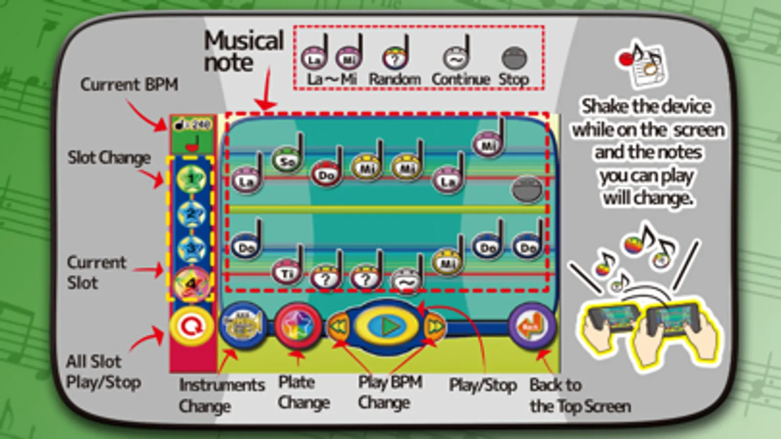 Shake the device while on the screen and the notes you can play will change.
