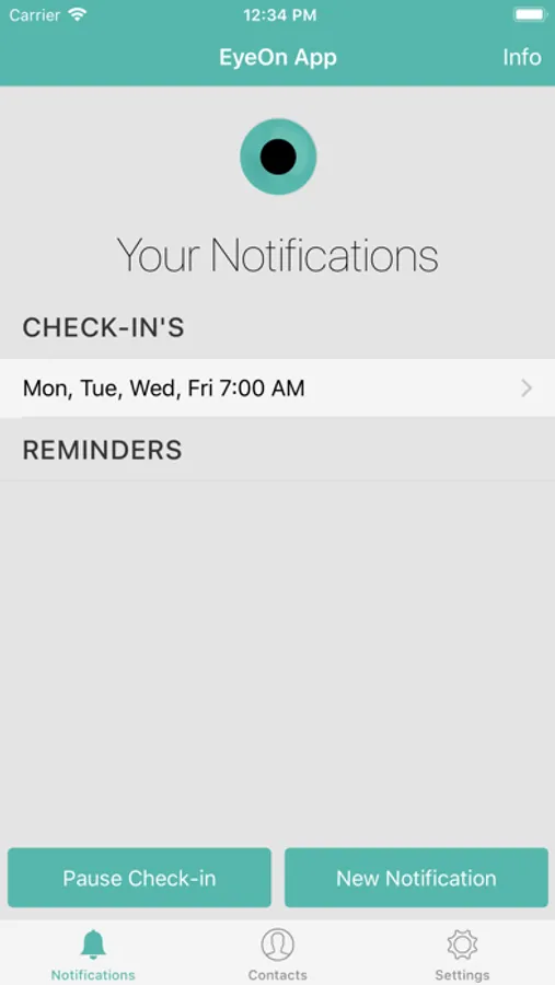 * You will receive a push notification at the scheduled time(s). This notification will ask if you are ok. If you would rather receive a Text Message (SMS) check-in, please visit www.eyeonapp.com for details and pricing (US only).