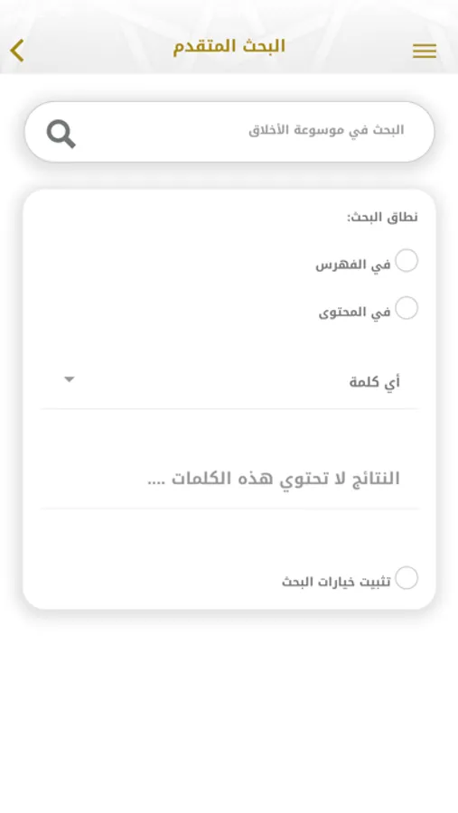 - خيارات بحث متقدمة عن أي مادة من مواد التطبيق.