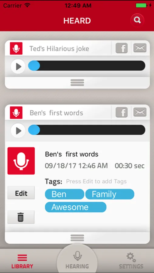 With HEARD, the length of the audio clip(s) you save are completely up to you. The interface is easy to navigate and you only keep what you “tap-and-tell” the app to go back and capture as soon as you’ve heard it. Every saved sound bite is stored in your personal library…and then the fun really begins! You can: