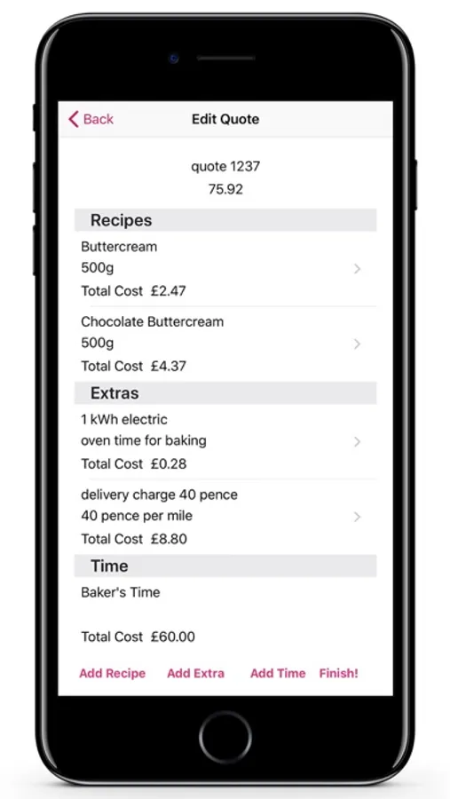 * Once you have created recipes, you can build customer quotes. You simply select the recipes that you will use to make the cake for your order, add them in (as many times as you need - helpful if you have a recipe for 12 cupcakes and you have to make 96!) then add in any extras such as boxes and ribbon and your estimated time on that order and you are done. You get a price that adds all this up, so you can see clearly what you need to charge to ensure you are not out of pocket. Yes it really is that easy!