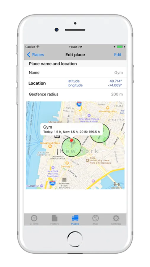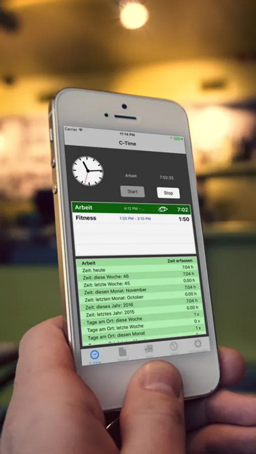 All this works automatically, without any need to start the app and press any buttons. Whenever you drive / walk into your defined places, C-Time will register your entering and start counting the time you spend at this place. When you leave this place C-Time will automatically stop counting.