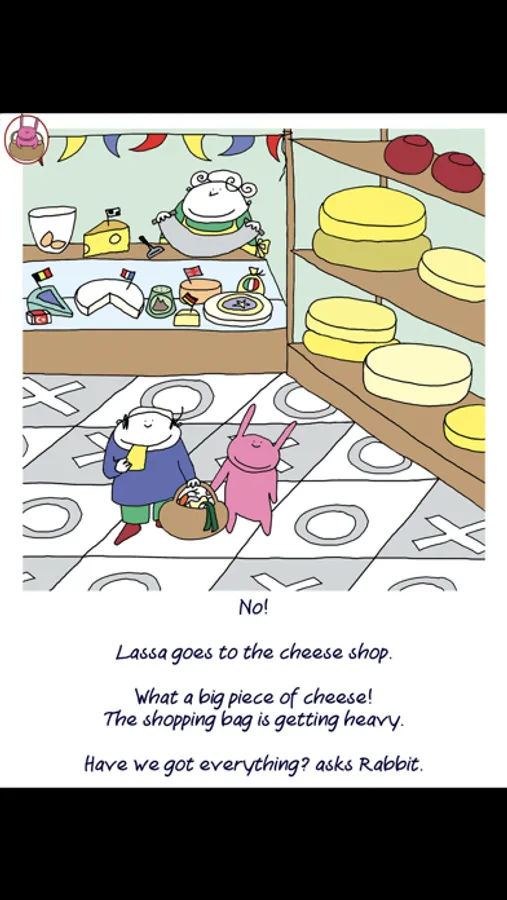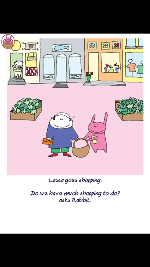 Lassa is shopping. Reading, telling and looking for groceries in the stores.