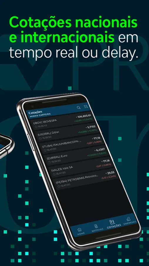 São cotações da B3 e das principais Bolsas de Valores internacionais em tempo real* ou em delay. Além disso, o Valor PRO traz dados macroeconômicos de 27 países, informações sobre os mercados de ações, moedas, taxas de juros e de crédito, derivativos, commodities, fundos e renda fixa.