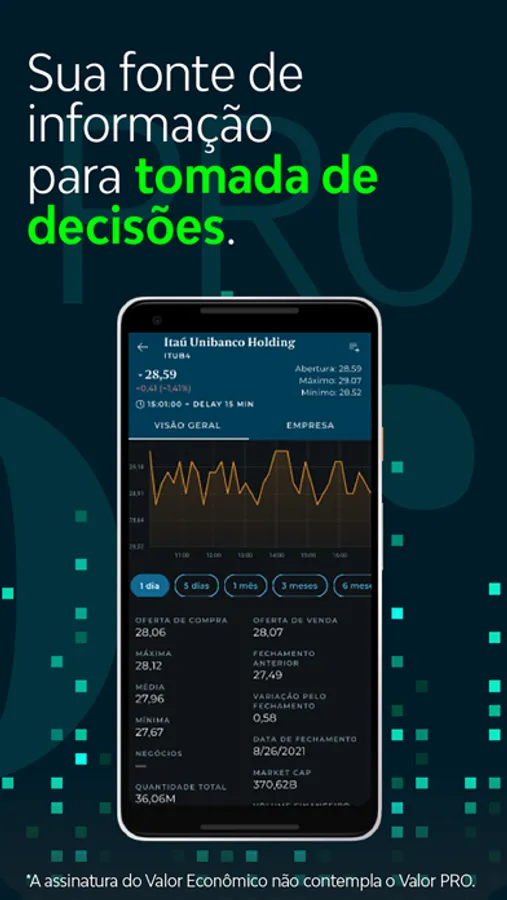 Com notícias dos bastidores do mercado, ferramentas analíticas e informações completas sobre finanças e negócios, o Valor PRO é um serviço de informações em tempo real, que une toda velocidade exigida pelo mercado à credibilidade do Valor Econômico.