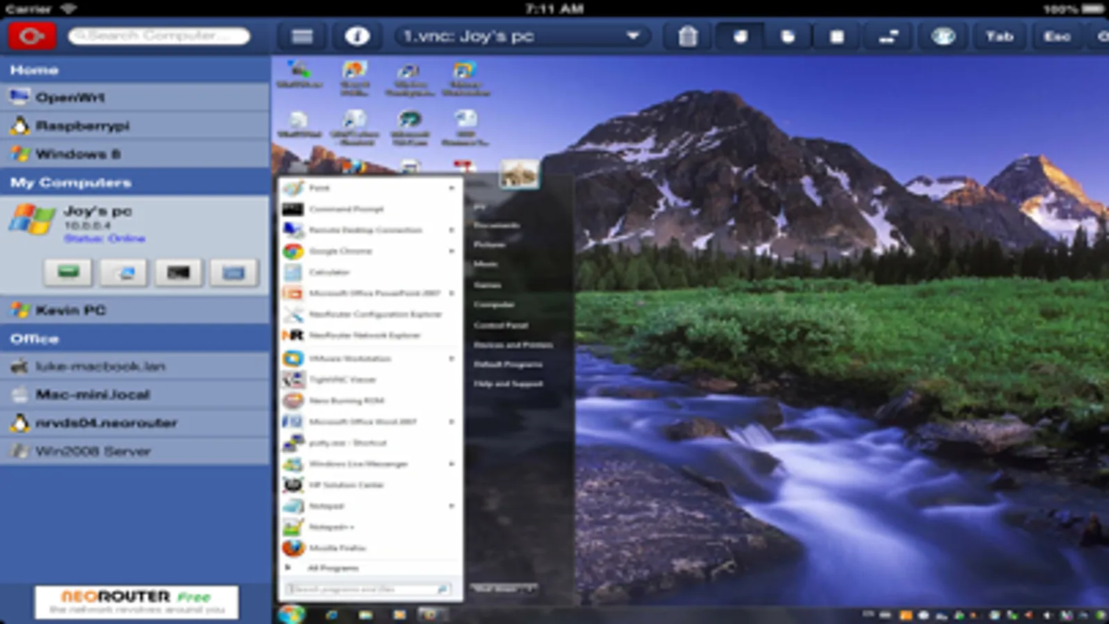 NeoRouter is a cross-platform zero-configuration VPN solution that securely connects Windows, Mac, Linux, FreeBSD computers and mobile devices at any locations into a virtual LAN. User can view the status of these computers and access them using various add-ons like remote desktop, terminal, file access, etc.