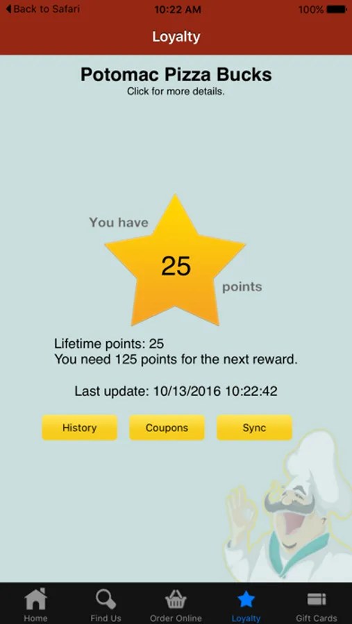 The official mobile app for Potomac Pizza is now here, bringing you the ability to order from all Potomac locations. Ordering from Potomac is as easy as eating a Pizza! With this app you can track your loyalty points, view your coupons, pay with your gift card and order your favorite food online.