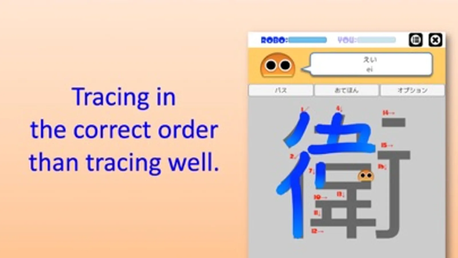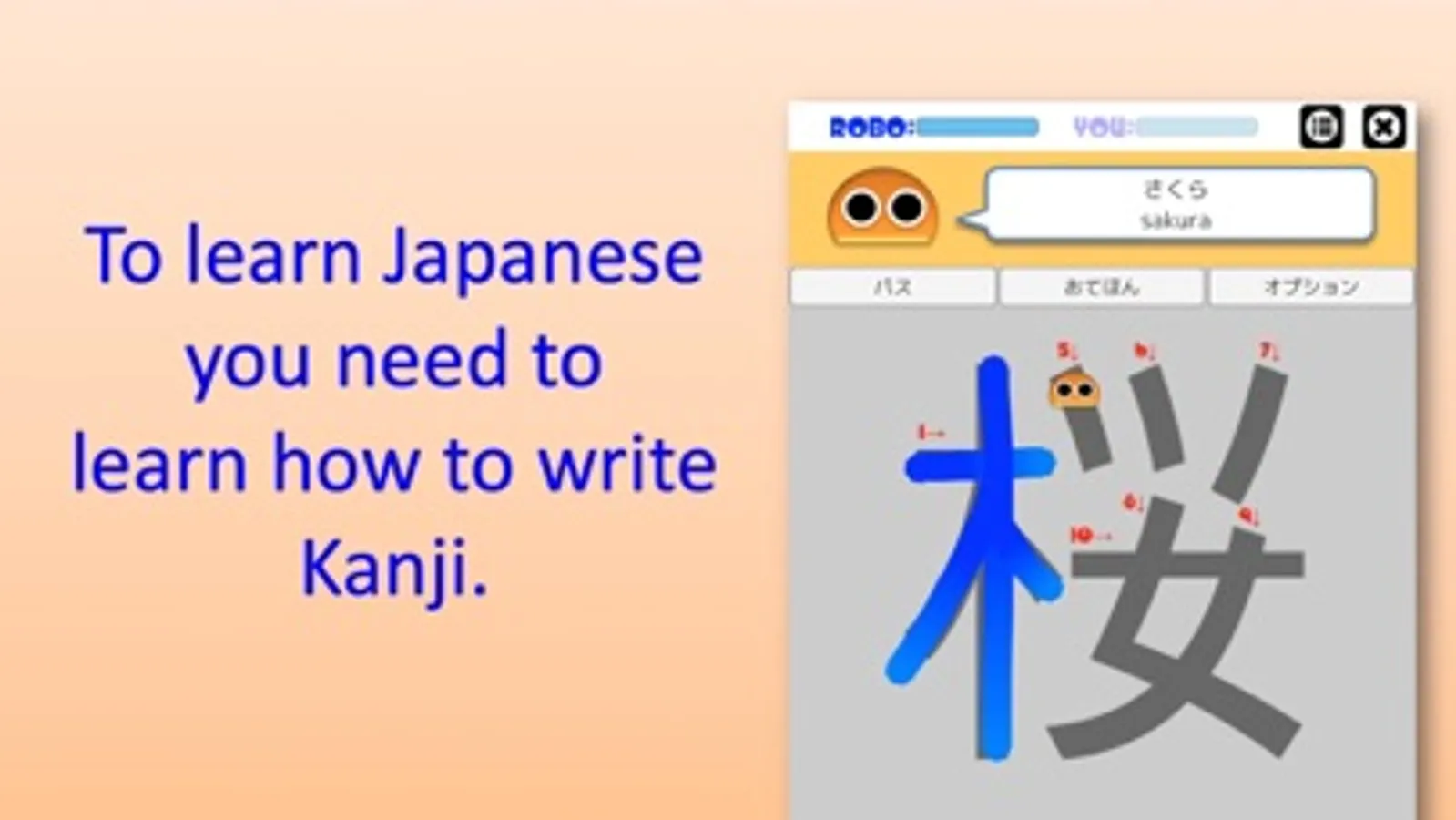 To learn Japanese you need to learn how to write Kanji characters. The best way to learn them is to practice writing them over and over but this can be boring. Instead, have fun and use this game to practice the correct way of writing Kanji - and beat the Robo!