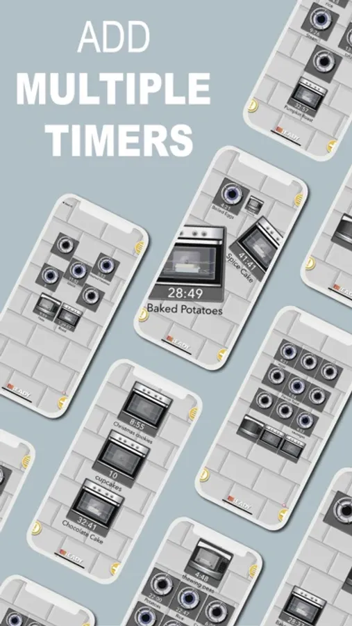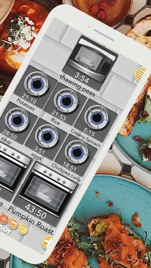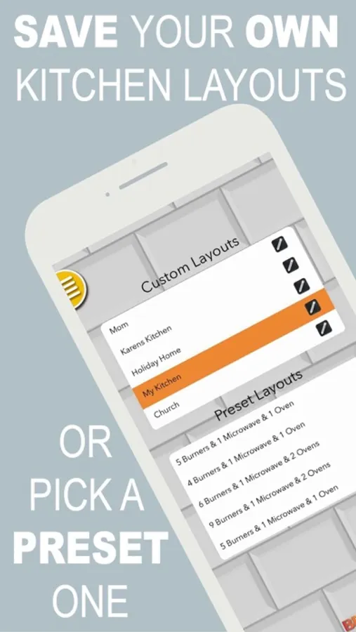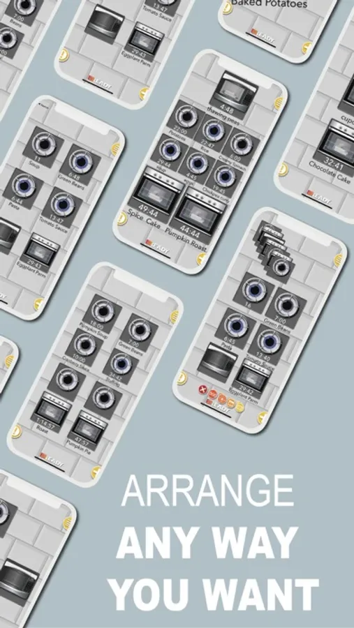Add as many timers as you need. Arrange, name and set up each timer individually. PLUS save up to 5 kitchen layouts or meals. Need a quick start? Use one of our preset layouts. Just drag and drop, pinch or pull to arrange your timers just the way you like.