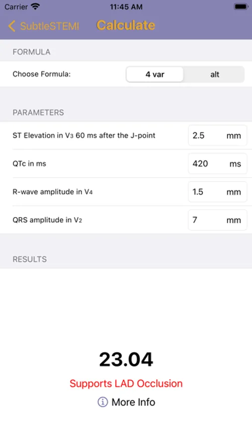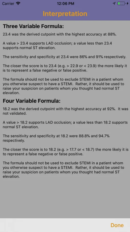 Calculator implementing the formula from the paper, "Electrocardiographic differentiation of early repolarization from subtle anterior st-segment elevation myocardial infarction," by Smith, et al.