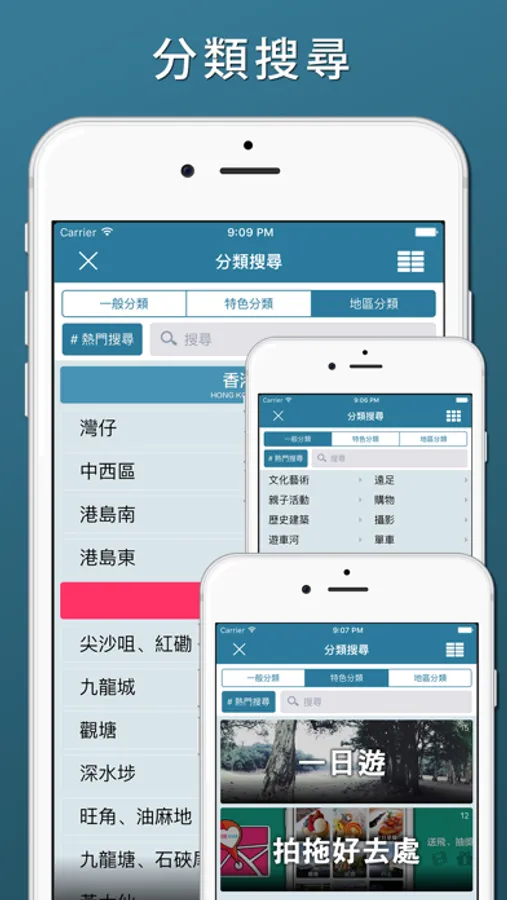 - 按地區和類別分類 ( e.g. 旅客熱點, 親子活動, 遠足 … )