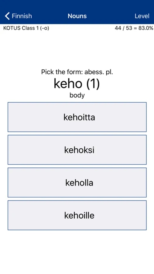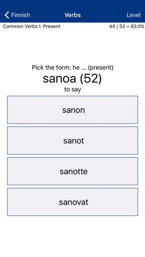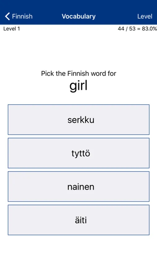 • Vocabulary: 215 levels, each testing the meanings of ten Finnish words. Interspersed among these are cumulative levels reviewing what has been learned earlier (for a total of 243 levels).