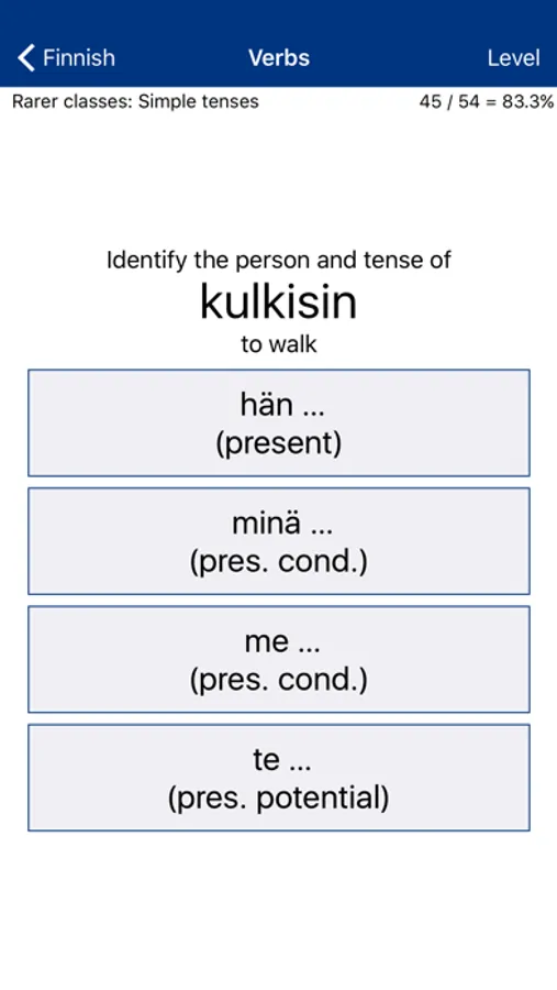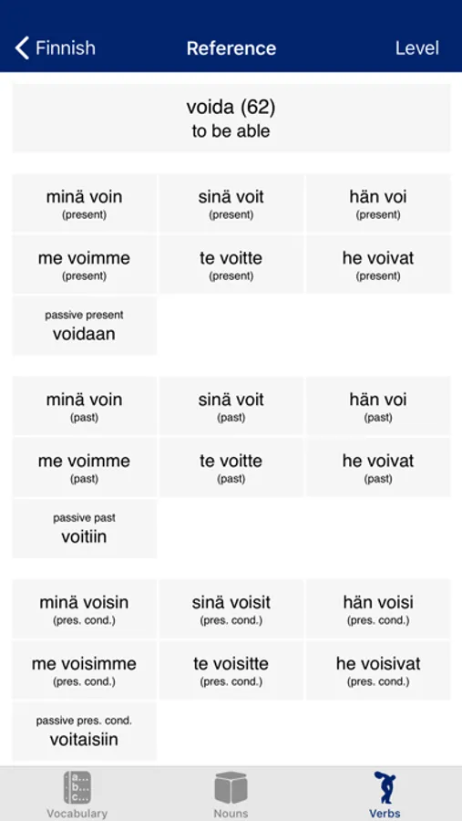 • Verbs: Tests your ability to parse and to conjugate all types of Finnish verbs.