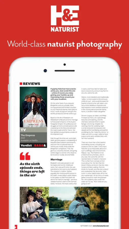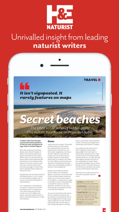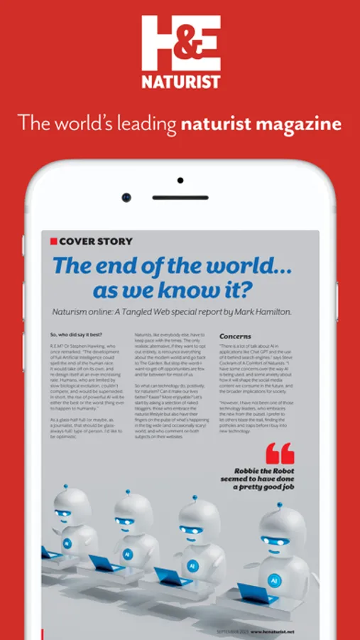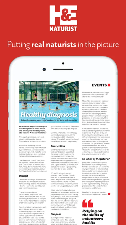 H&E is the leading monthly magazine aimed at naturists and all those who enjoy any aspects of their lifestyle without the restrictions of clothing. H&E originally stood for “health and efficiency”, the theory being that continued exposure to the sun and air, in combination with a good diet and regular exercise, was beneficial to health and made the body work more efficiently. Nowadays, naturism is more of a lifestyle choice with much less importance placed on the perfect body image – and more emphasis on travel, sunbathing, naked activities and, most of all, fun.