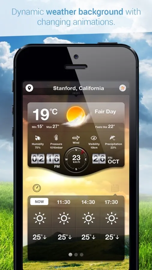• Dynamic weather background with changing animations, to reflect real-time weather conditions and also day time / night time of any given location.