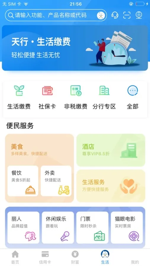 “生活”频道中还提供了美食、洗衣、洗车、电影票、火车票、娱乐票务、生活缴费、话费流量充值、特惠团购、医疗服务、代驾服务等服务功能。