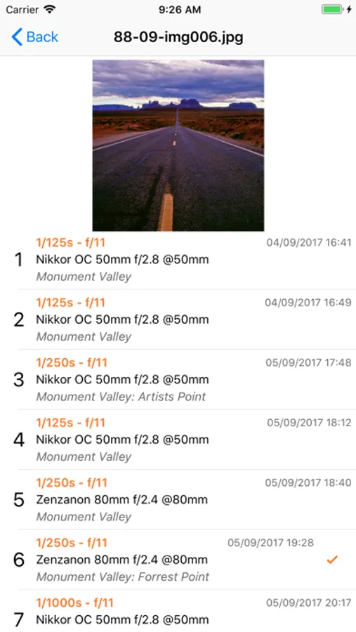 * Record the lens, focal distance, aperture, shutter speed and geolocation of each photograph.