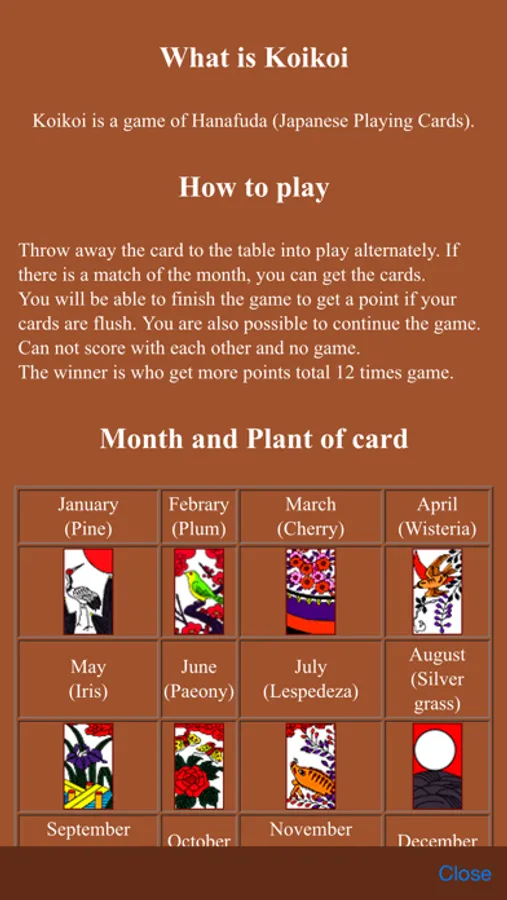 Koikoi is a game of Hanafuda (Japanese Playing Cards).