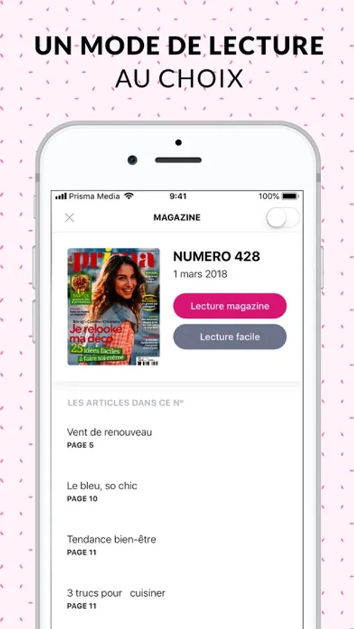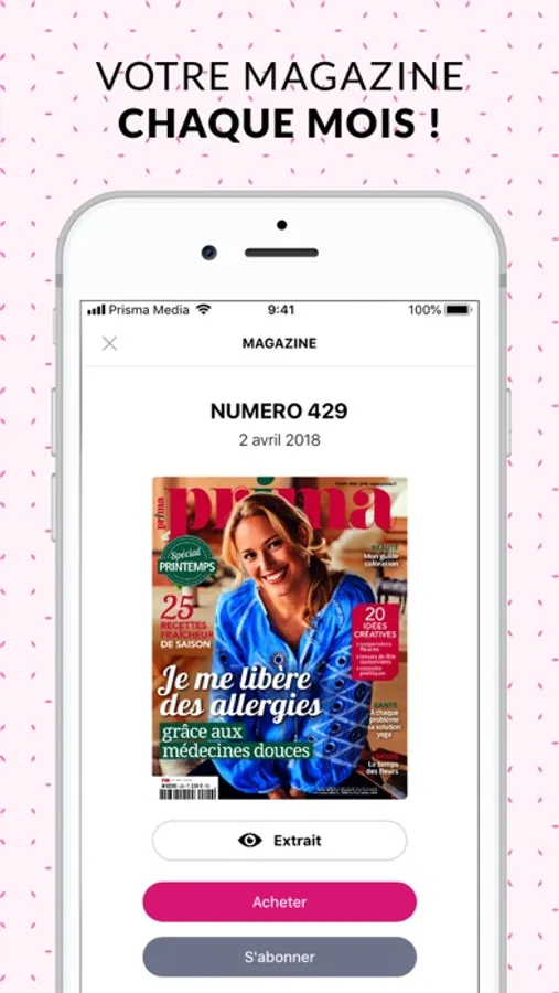 “Avec Prima, exprimez votre créativité ! Trouvez l'inspiration parmi des idées et loisirs créatifs et embellissez votre quotidien avec des conseils et infos mode, bien être et loisirs. L'abonnement coloré de celles qui aiment créer.”
