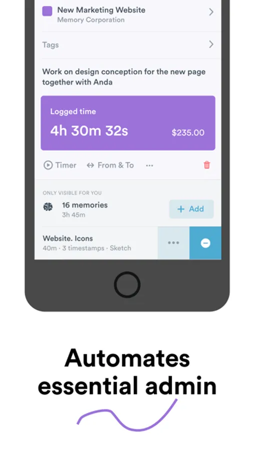 Everything is tracked for you in the background. Just focus on productive work and log your hours whenever you like; it only takes a click.