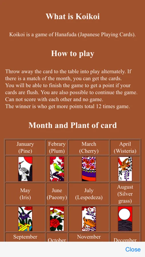 Koikoi is a game of Hanafuda (Japanese Playing Cards).