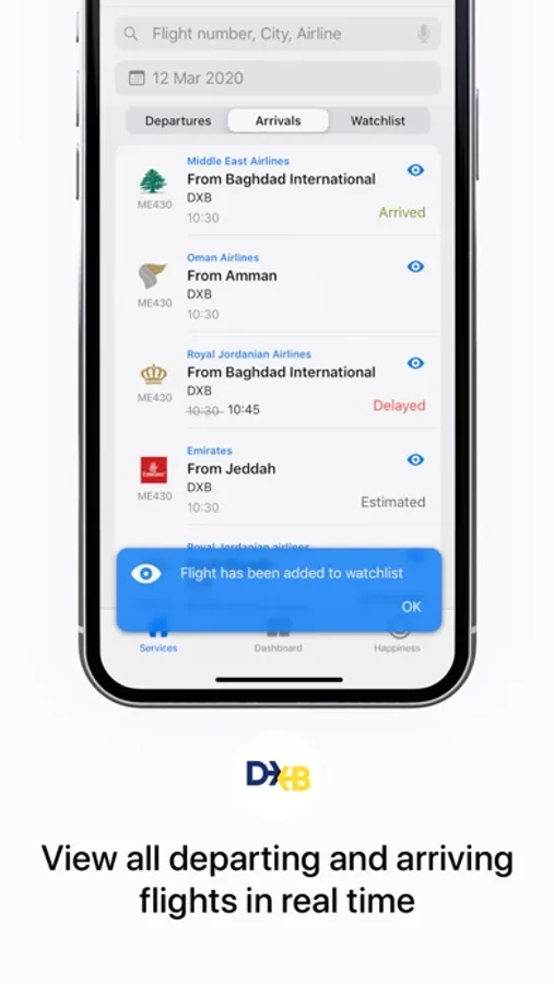 Check real-time flight information from Dubai Airport and watchlist flights of interest.