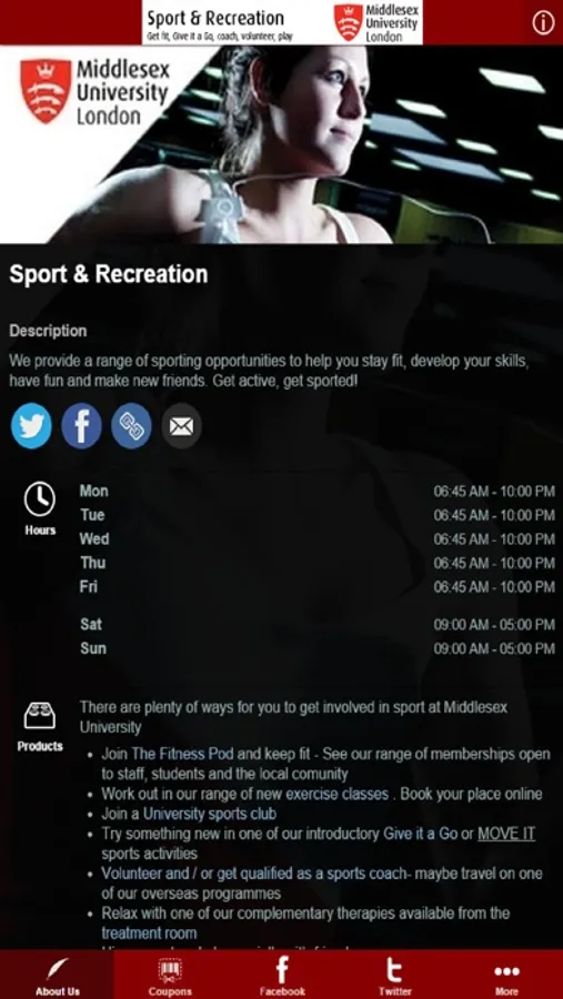 The app is a one stop shop for Sport & Recreation activities at Middlesex University. Join in our Facebook and Twitter feeds, buy Middlesex sports merchandise online direct from your mobile device, visit our website for the latest news and information, register for sports events, sports coaching, volunteering and much more.