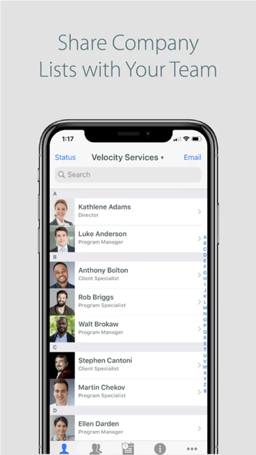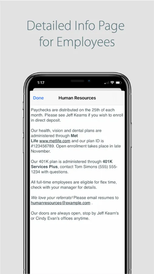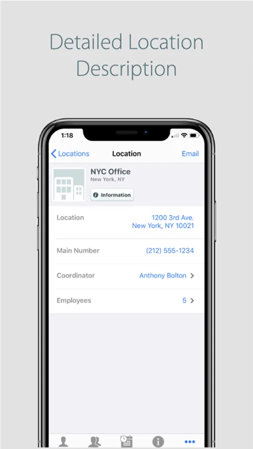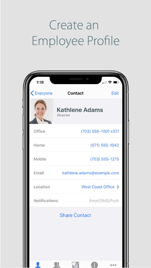 Each Employee manages their own profile; upload a picture, phone number, email, and biography. Make updates on your phone and immediately update your profile in co-workers phones.