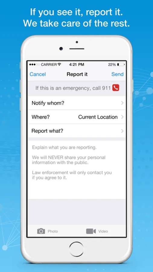 • “Report it!” lets you contribute to your community’s safety. Share crime tips, traffic alerts, broken mains, fallen trees … even lost pets! Add related photos/videos to each report.
