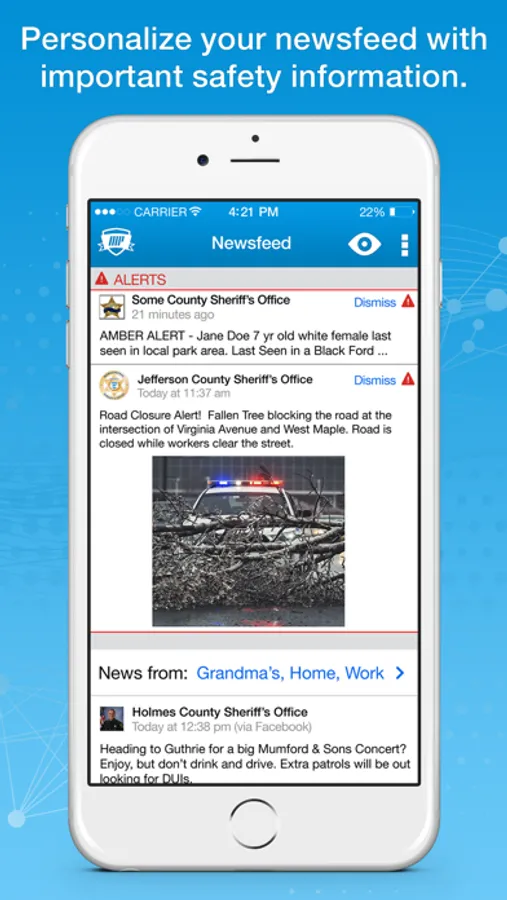• Quickly view relevant safety news and alerts from your Neighborhoods right on your Newsfeed. No more combing through daily social chatter to find important information!