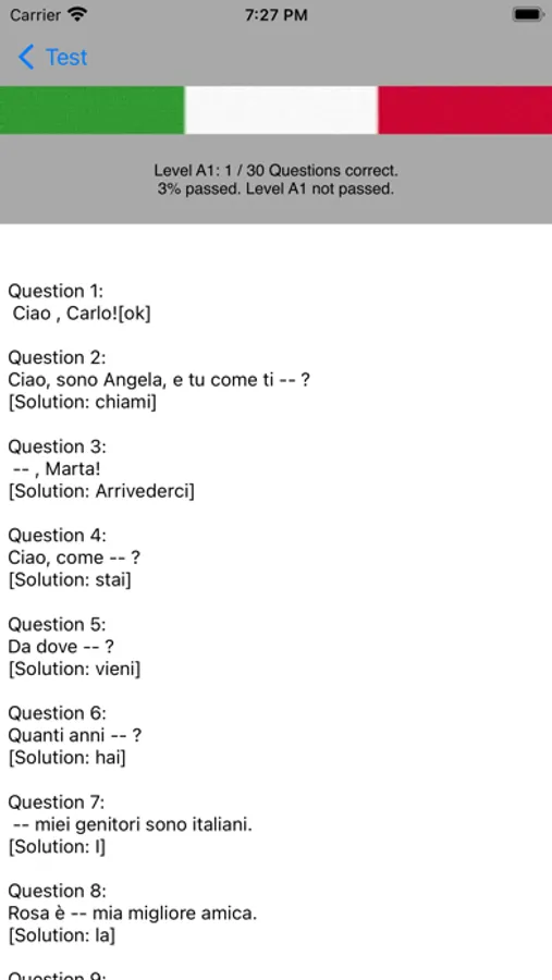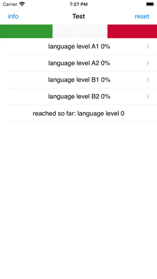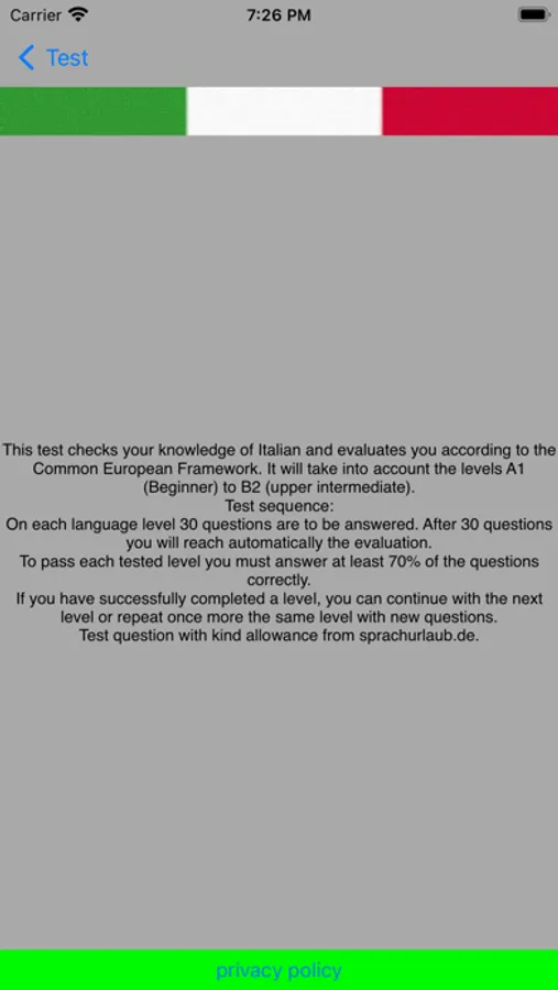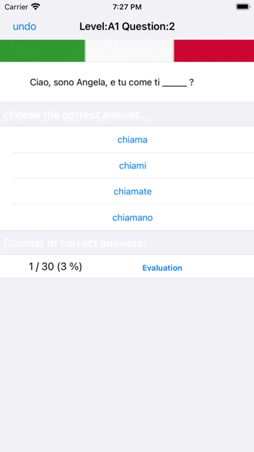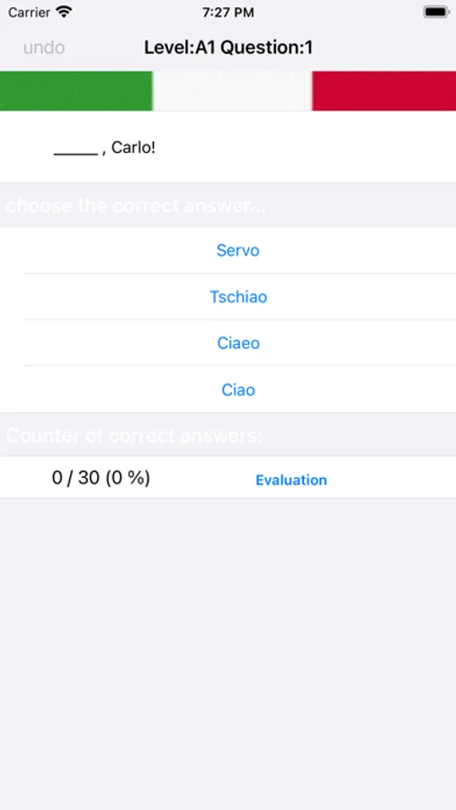 On each language level 30 questions are to be answered. After 30 questions you will reach automatically the evaluation. With the button "evaluation" the unanswered questions are skipped, and the evaluation of the already answered questions can be displayed.