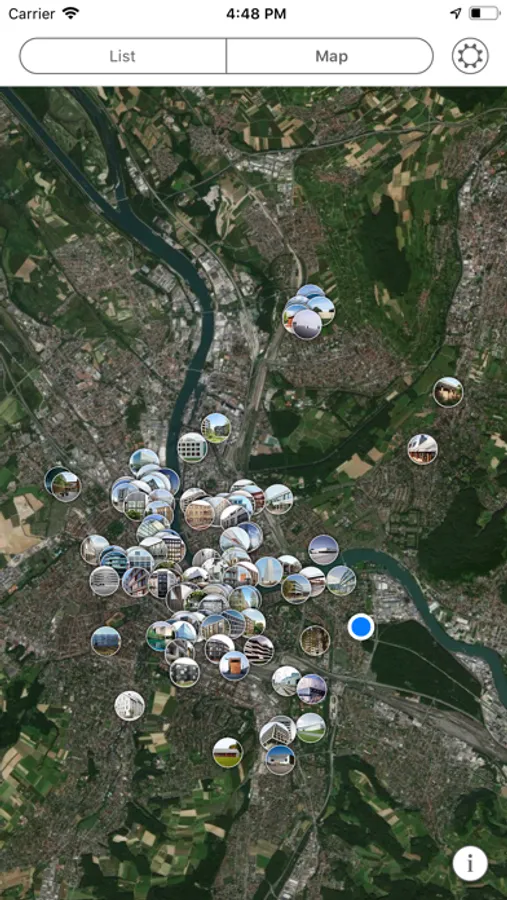 - detects buildings close to you, sorts them according to their distance and leads you to them using a compass.