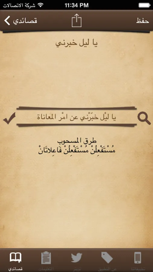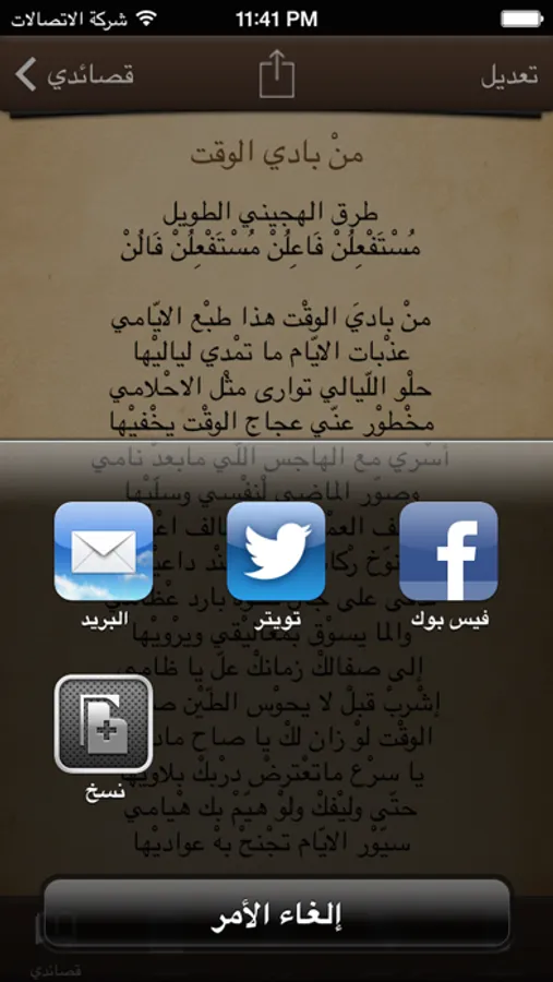 - مشاركة القصائد عبر: فيس بوك، تويتر، الإيميل، الواتساب والرسائل.