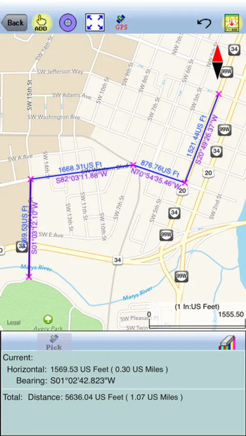 The Node tool provided by Cruise Angle iCMT will let you drop nodes precisely to delineate a line or an area to view the measurement value. You could also add your GPS location as a node. Please note: Location data depends on the GPS receiver used. Continued use of GPS running in the background can dramatically decrease battery life. The app will let you easily toggle the built-in GPS on or off. This app comes with a built-in help file.