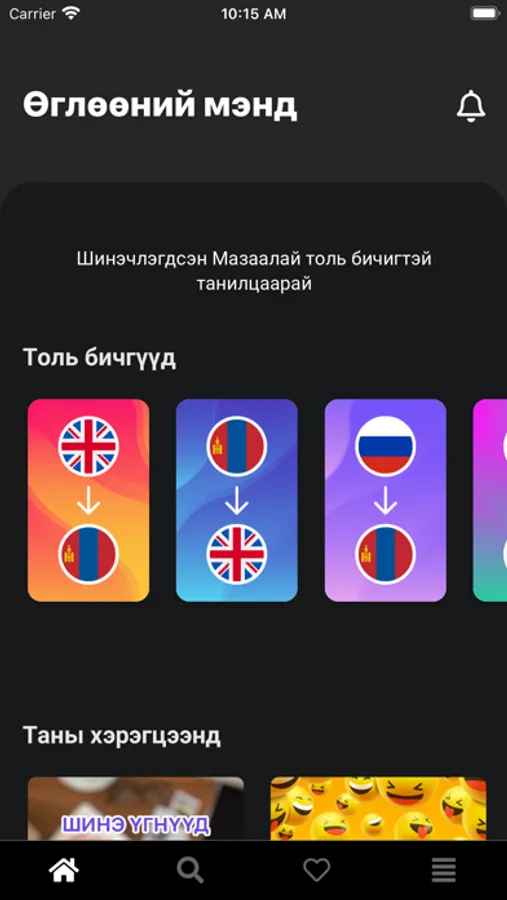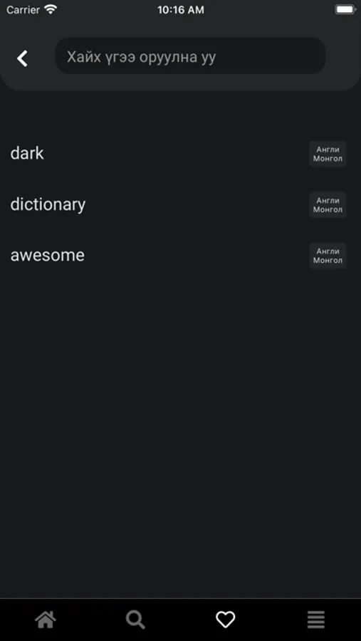 Хамгийн баялаг үгсийн сангаас бүрдсэн Англи-Монгол, Монгол-Англи, Орос-Монгол, Монгол-Монгол толь бичиг таны утсан дээр. Хэрэглэхэд хялбар, интернэтгүй ашиглахад тохиромжтой. Сонирхсон үгсээ хадгалах, дан ба холбоо үгс орчуулах, мѳн үгсийн санд ѳѳрийн орчуулгаа оруулах боломжтой.