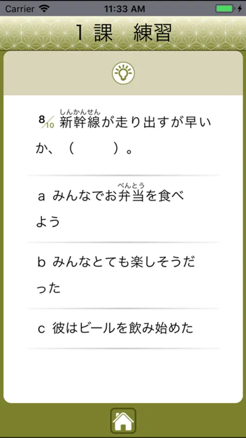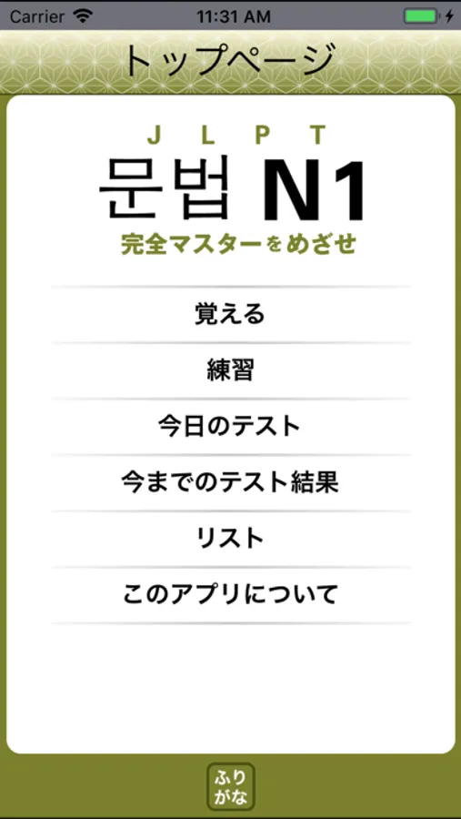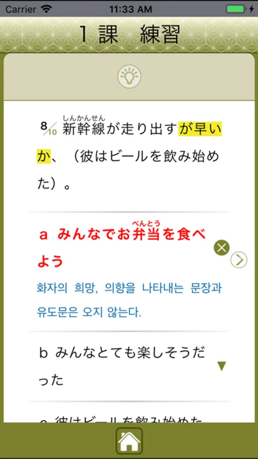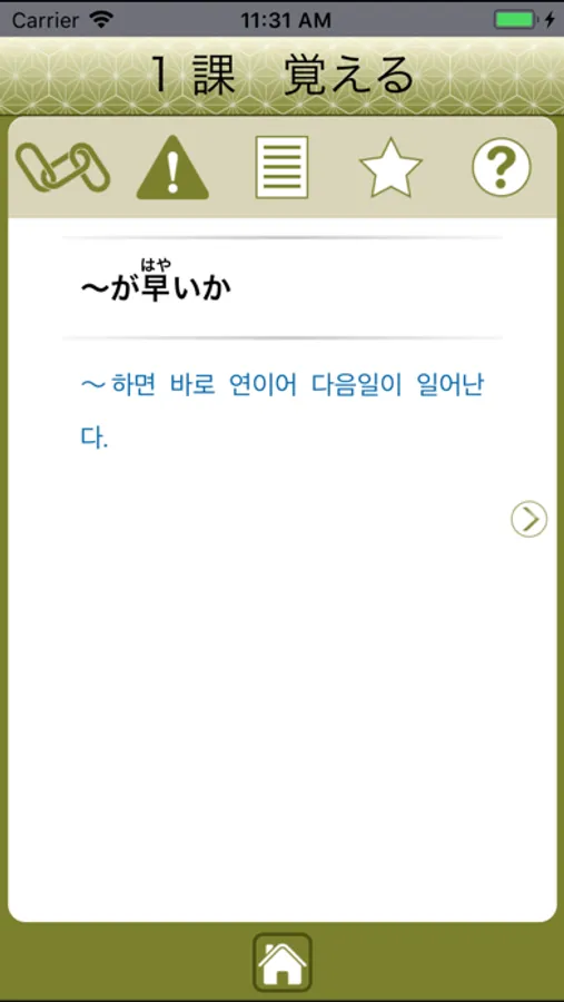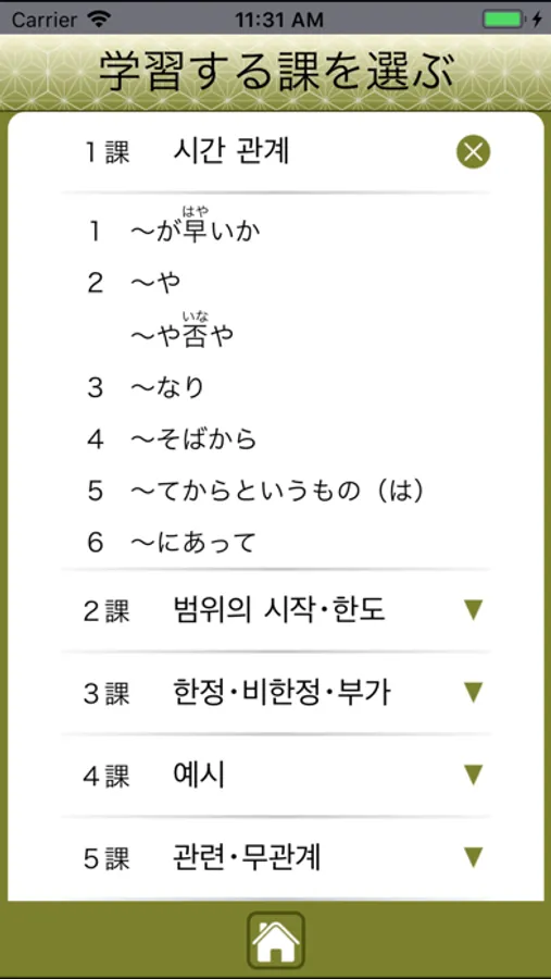 「リスト」:文法形式を五十音順、課順、お気に入りで並べ替えて、学習したい文法形式を選ぶことができます。