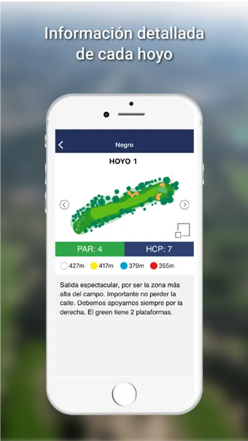 Con ésta aplicación puede acceder a la información de cada hoyo con los comentarios realizados por un profesional aconsejándole la mejor forma de jugar, anotar los resultados permitiéndole llevar un control de los golpes realizados y realizar de forma automática el calculo de puntos stableford, archivar sus tarjetas, editarlas y consultar los records (Máxima distancia recorrida, menos número de golpes y mayor puntuación stableford) y compartir todo ello con sus amigos.