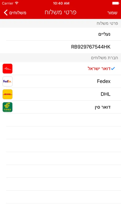 ניתן לערוך את פרטי המשלוח על ידי לחיצה על תמונת חברת המשלוחים.