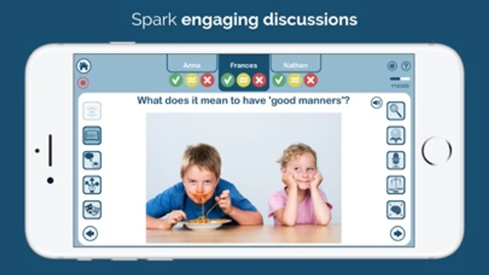 2) START THE CONVERSATION. Look at the picture, then touch any of the 10 buttons to see a question. The questions on the left are simpler (like “What is…?”) while the ones on the right are more complex (“How do you know…?”). Hear the question aloud, record your own audio, and score answers as you go.