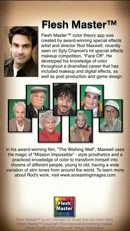 Award-winning special effects artist and director Rod Maxwell, seen on Syfy Channel's hit special effects makeup competition Face Off, developed Flesh Master™ to help artists train their eyes to match colors at a glance! As seen in Make-Up Artist Magazine; used by Oscar and Emmy winning makeup artists to polish up their color matching skills while on the set!
