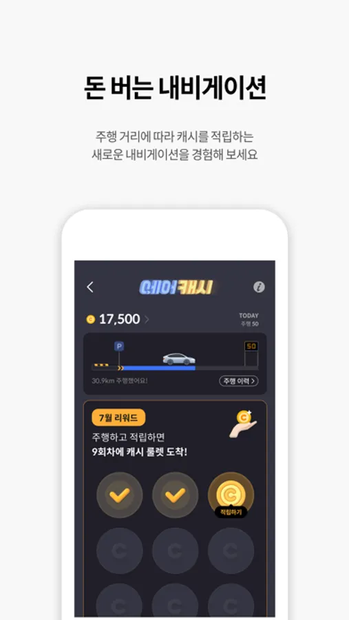 주행 거리에 따라 캐시를 적립하는 새로운 내비게이션을 경험해 보세요!