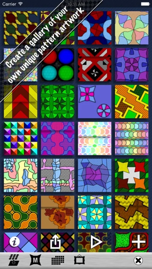 Download Pattern Artist Free to discover just how fun creating artistic patterns can be. The free version of the app allows you to try out all the features of Pattern Artist, limiting only the number of templates and color schemes provided, the number of custom color schemes you can create, and the output resolution of some of the tools.