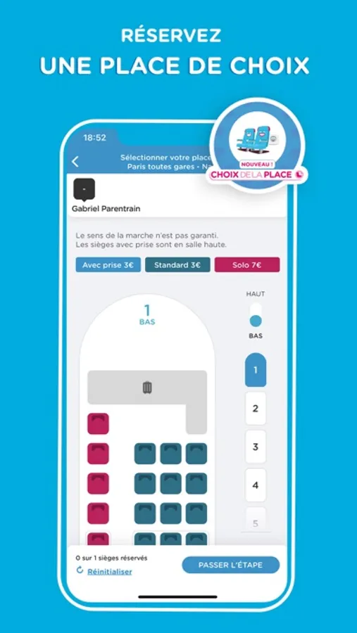 • Choisissez votre siège standard (+3€), prise (+3€) ou solo (+7€) avec l’option CHOIX DE LA PLACE