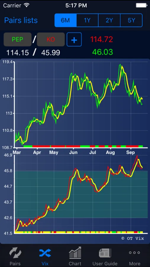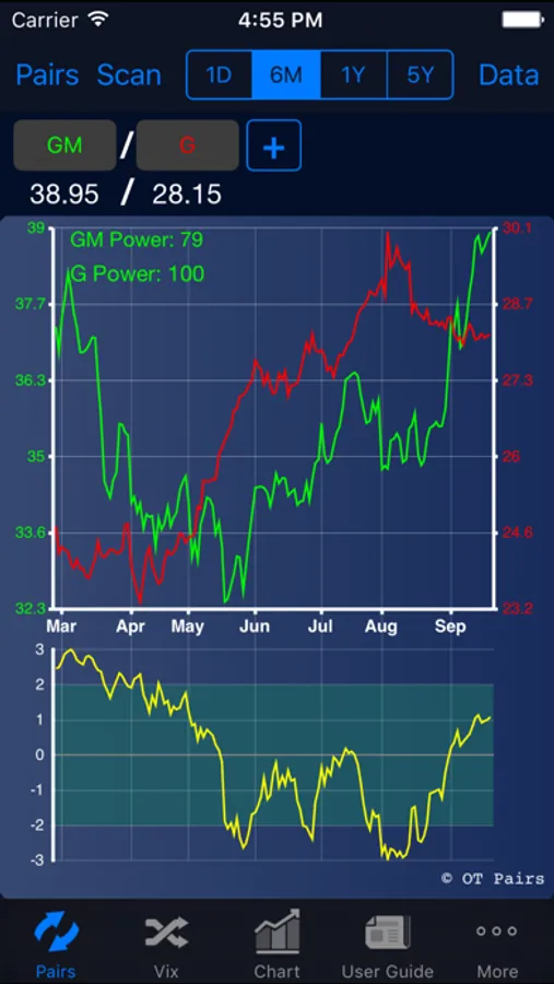 OT Pairs is the first mobile app that gives users access to one of the most profitable and time tested hedge fund trading strategies. Pairs trading involves the simultaneous buying and selling of two closely correlated stocks which have temporarily been mispriced. Once a signal is triggered, the app will even display the price ratio and the exact number of shares to buy and sell.