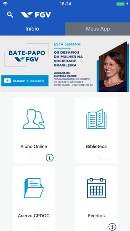 Busque por eventos, livros, notícias, índices econômicos e arquivos históricos através de funcionalidades como: “Biblioteca”, “Eventos” e “Acervo do CPDOC”. Além disso, no “Aluno Online”, você pode acompanhar seu histórico acadêmico e o calendário estudantil do seu curso.