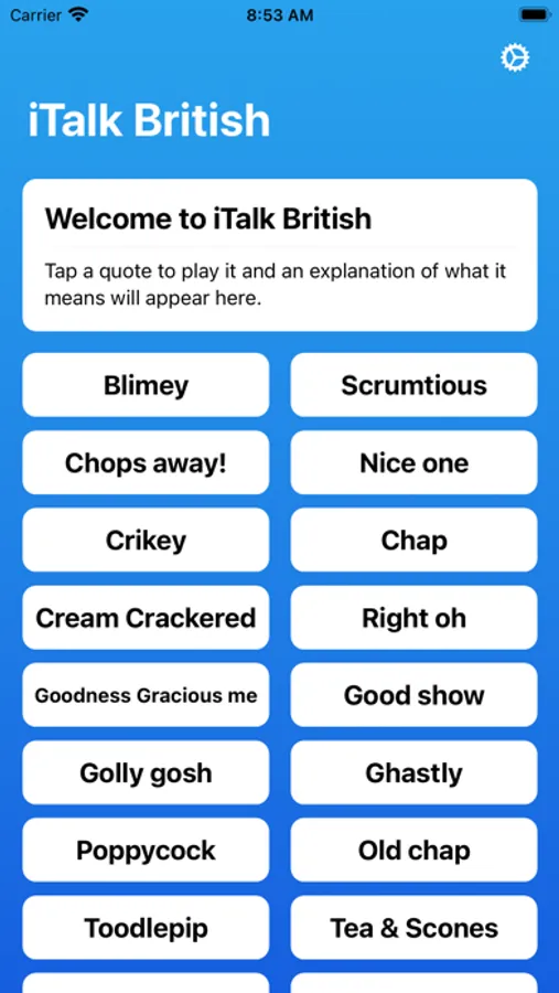 Talk like a British person with an explanation of each word displayed at the top of the screen.
