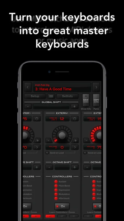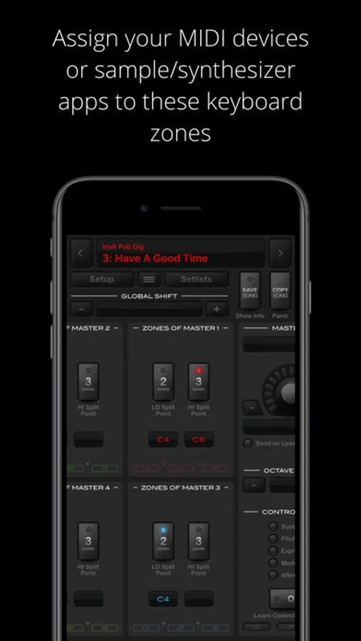 After connecting your keyboards and other MIDI devices to the iPad, you can easily create split zones and assign sounds of your MIDI devices to them. It's also possible to route the MIDI data to other apps if they have a virtual MIDI port. Furthermore, you can filter out controllers which is great if you want e.g. pitch bend or sustain to affect only a subset of the active sounds.
