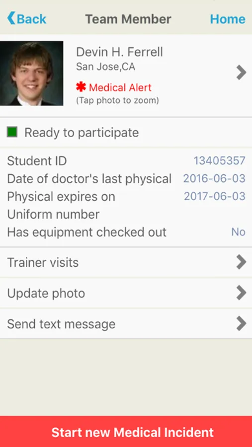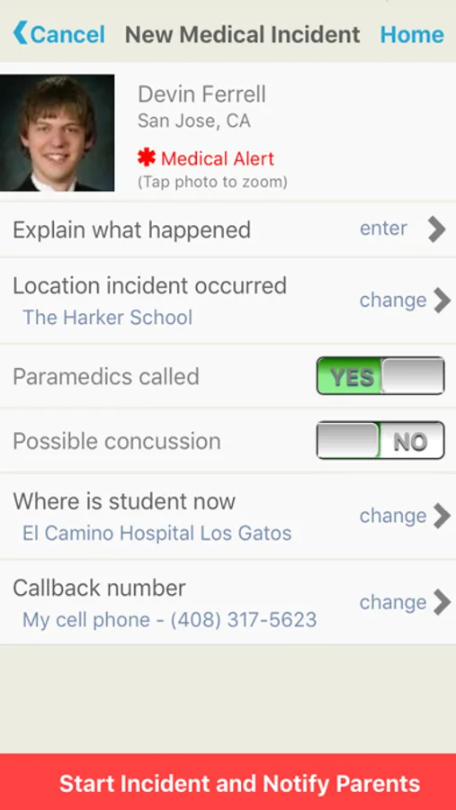 Start injury notification system to parents that automatically sends them text messages, email with map and directions, and automatically locates parents via phone